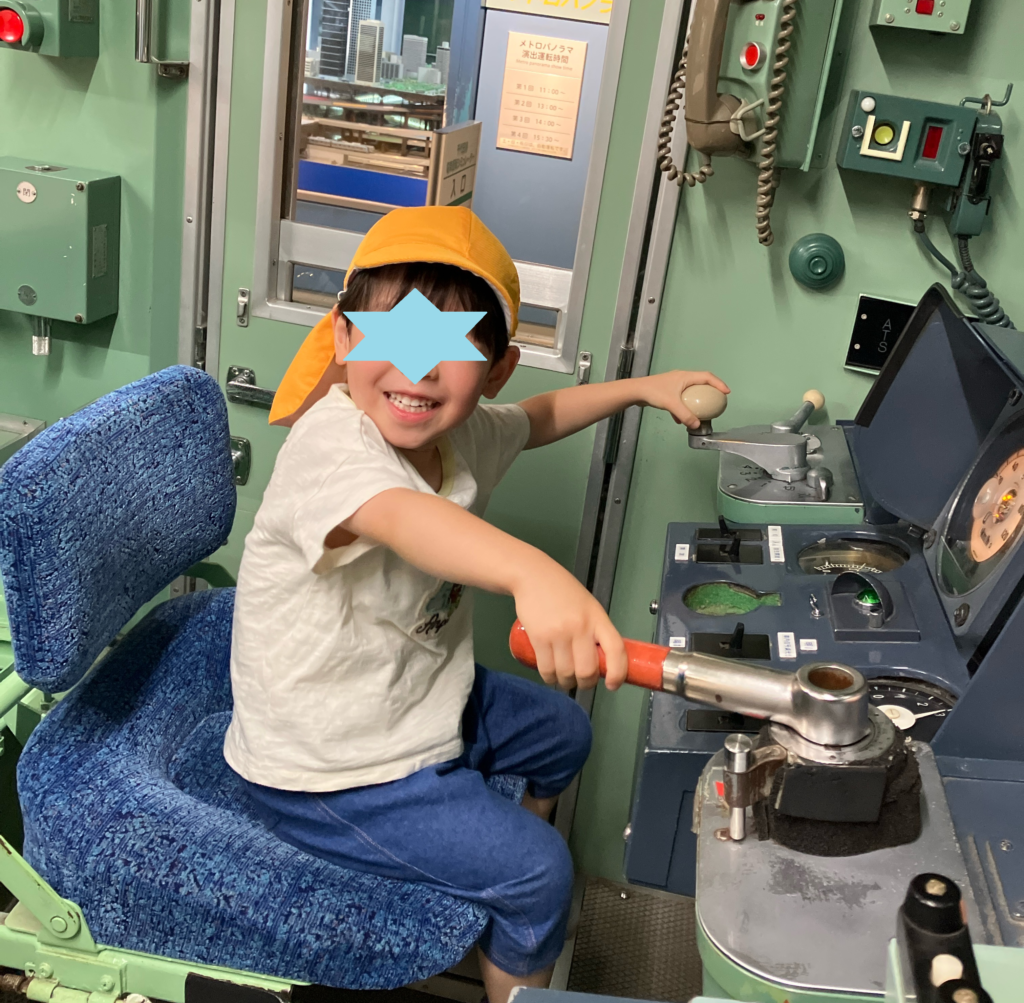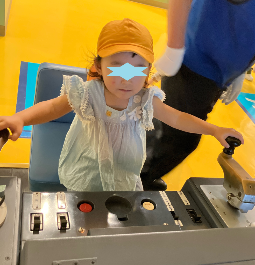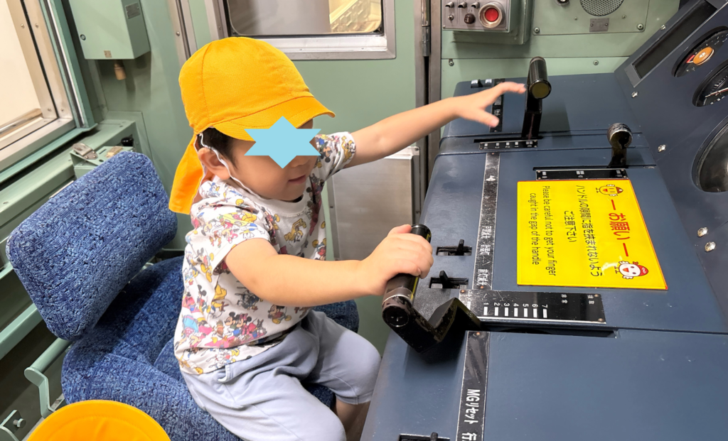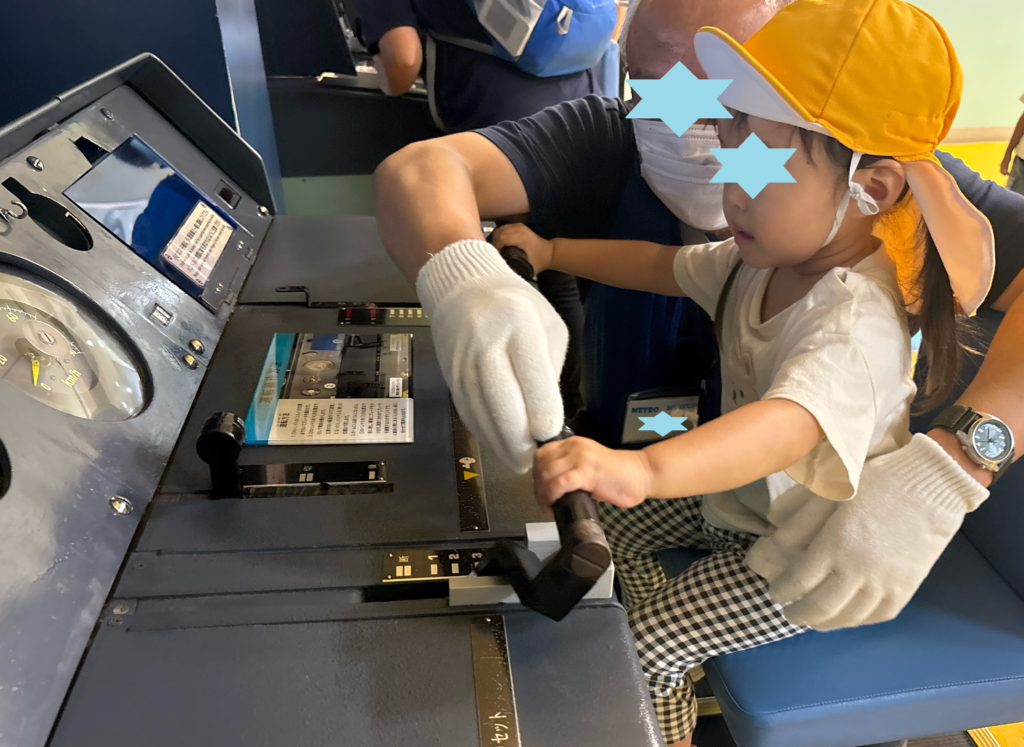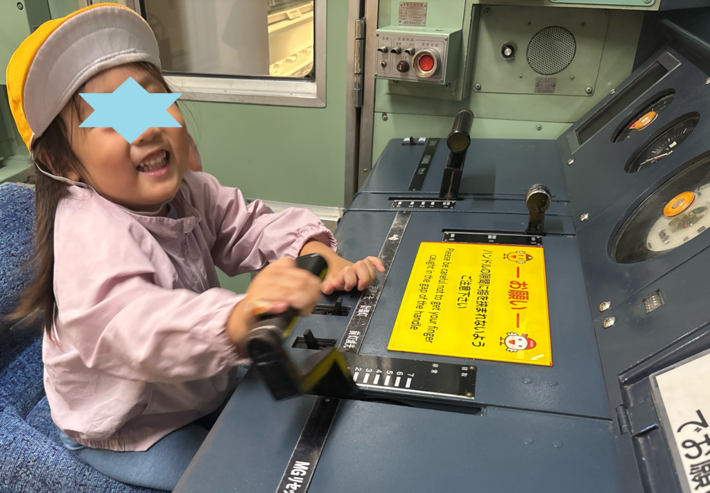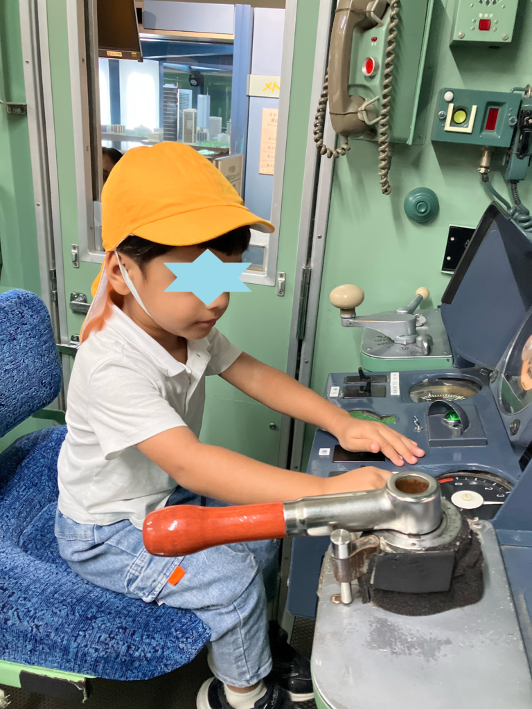 運転席に座って、レバーを引いたり、本当の運転手さんと同じ映像を見ながら運転を体験しました!