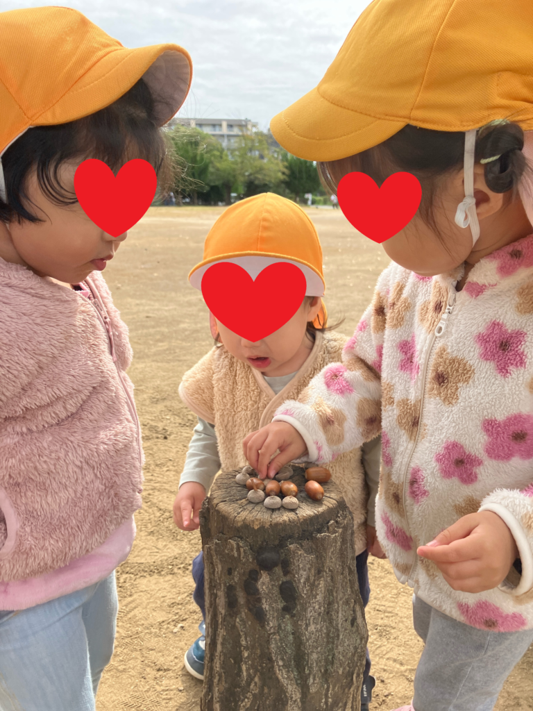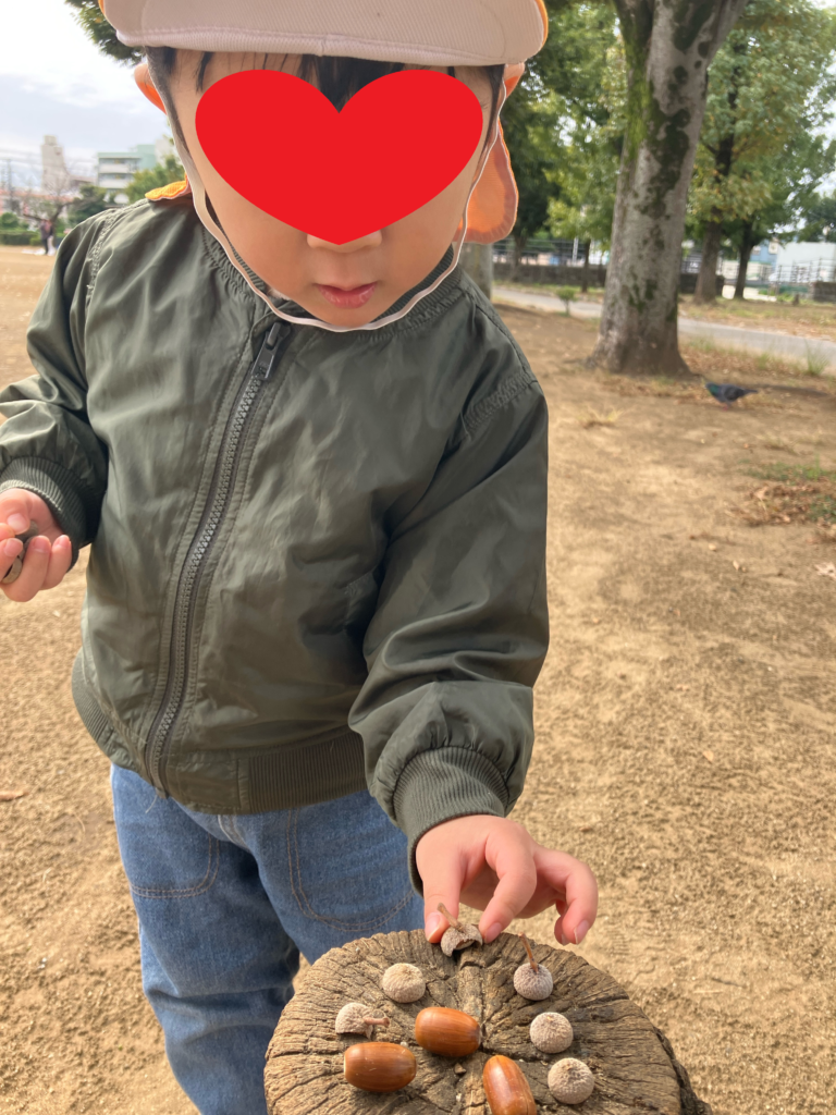 集めたドングリを切り株の上に並べてお料理ごっこをしたりして楽しんでいましたよ♬