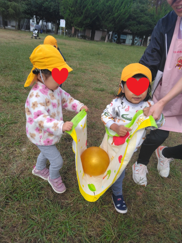 にじぐみさんとそらぐみさんで力を合わせてボールが落ちないように運びます!