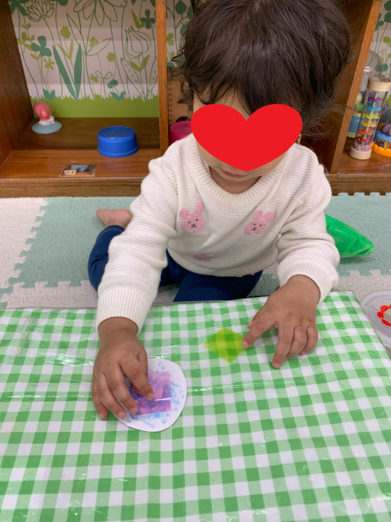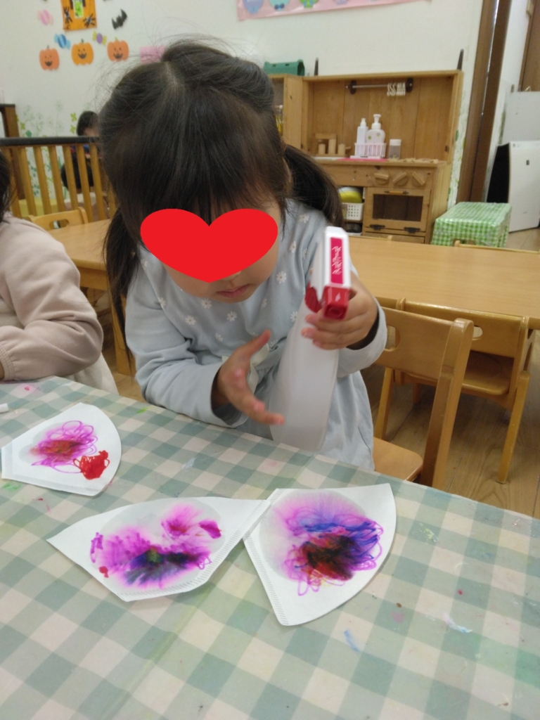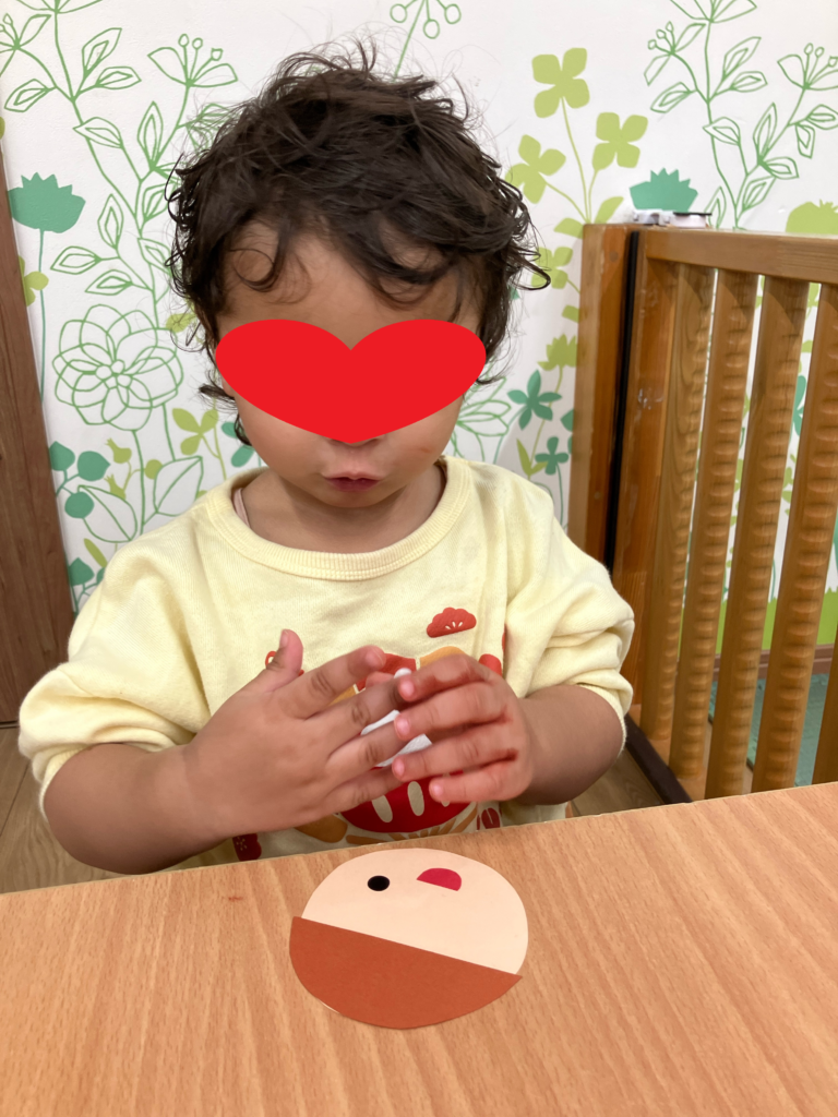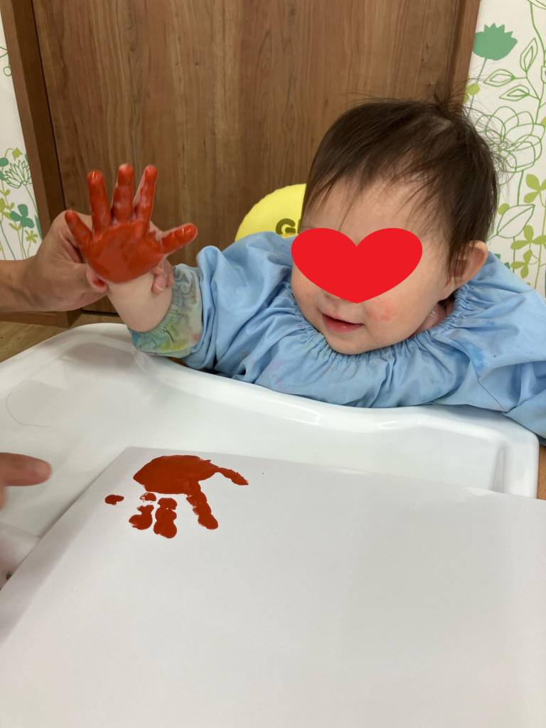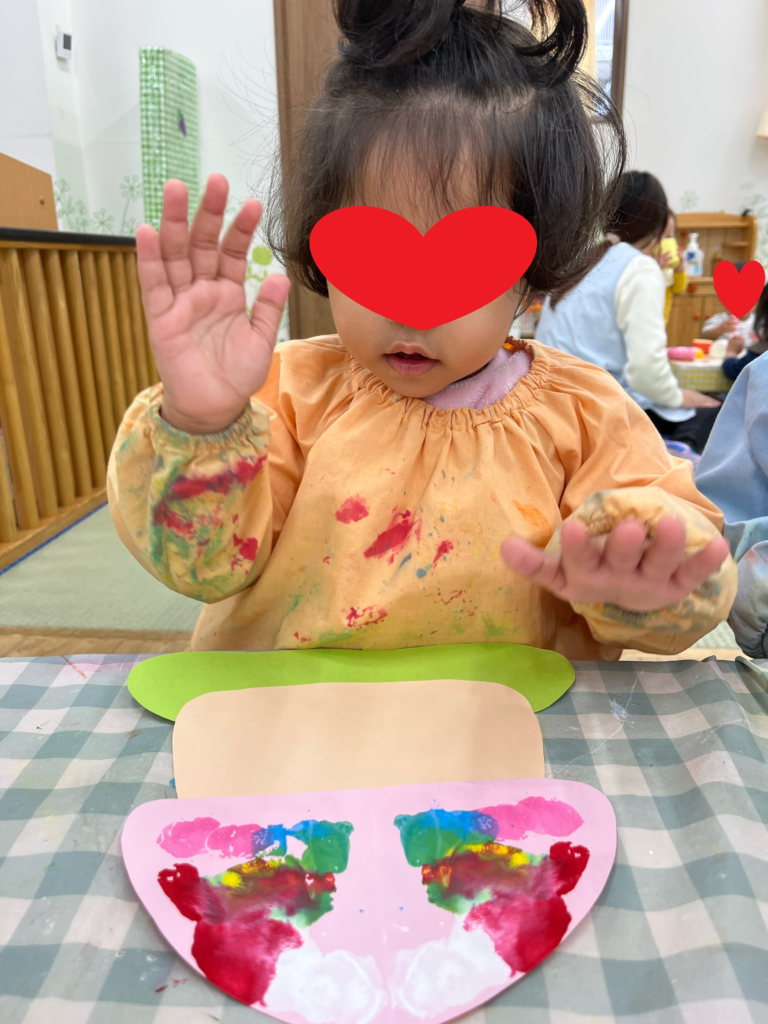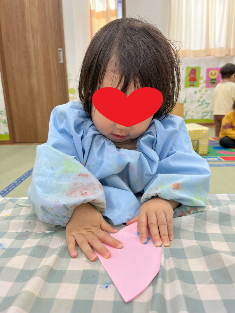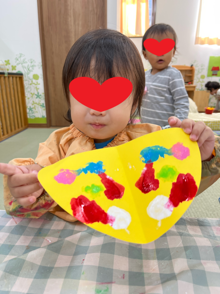 にじぐみさんはタンポでスタンプをして、半分に折っておててでスリスリ。ゆっくり開いてみると・・・
