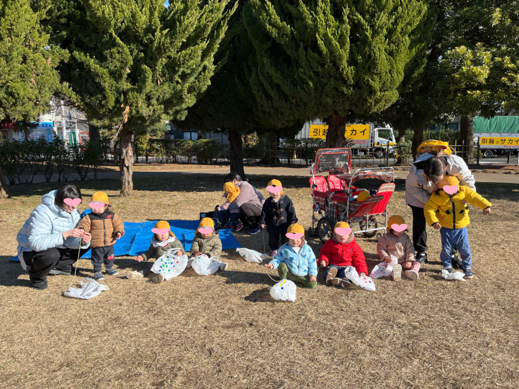 別の日にはにじぐみさんは凧作りにも挑戦!!手作りの凧を持って駅前公園で凧あげをしました。