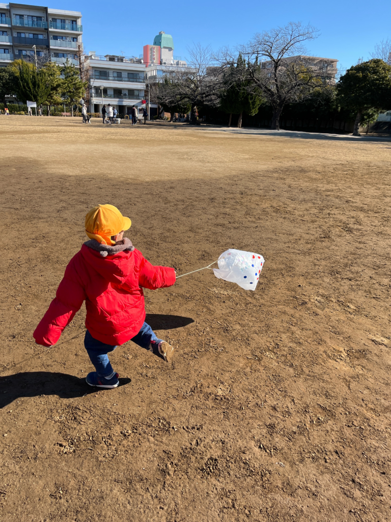 手を高くのばして持ったり、凧があがっているか後ろを見ながら走ったり、一生懸命な姿にキュンとしました😊