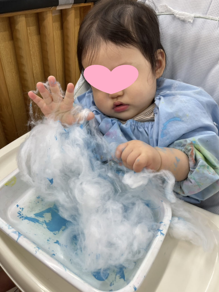 バットに入っている絵の具をつけながら綿を揉みこんで、、、何ができるのかな?