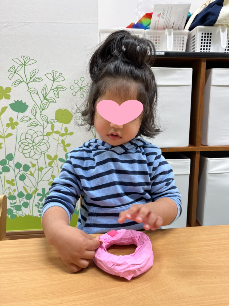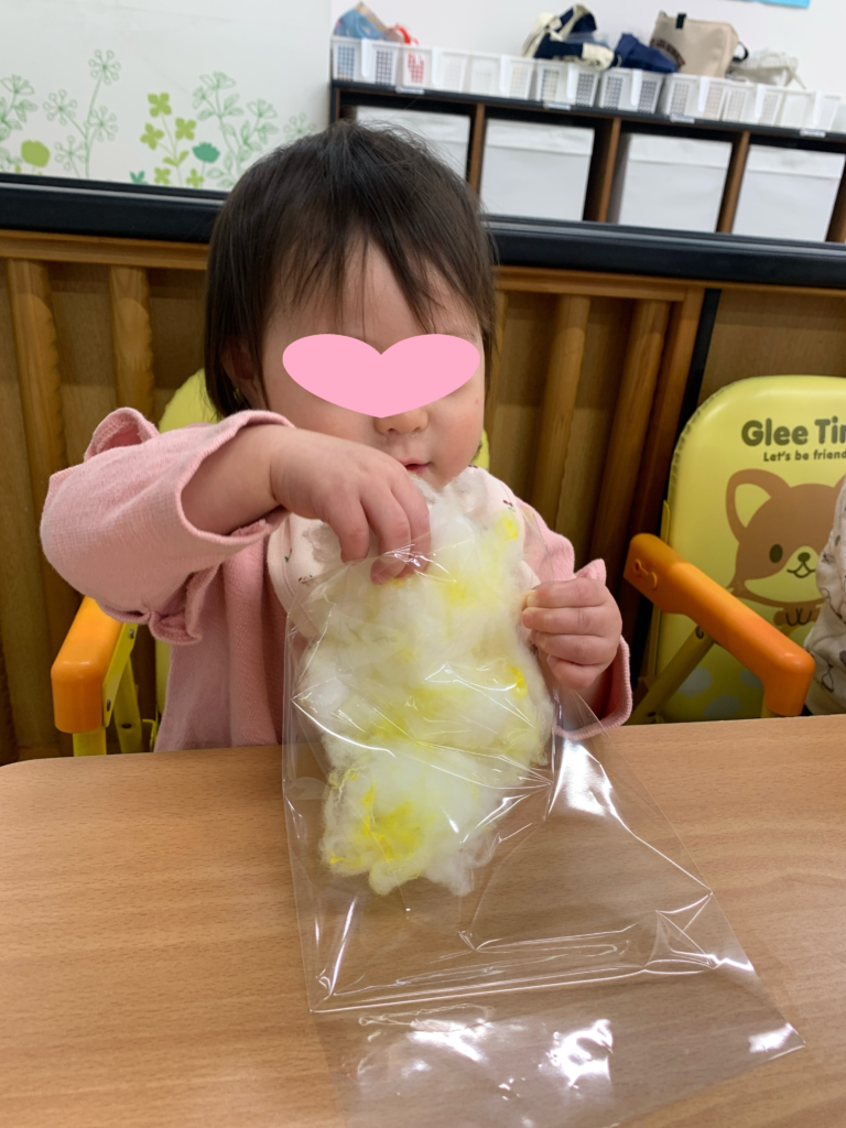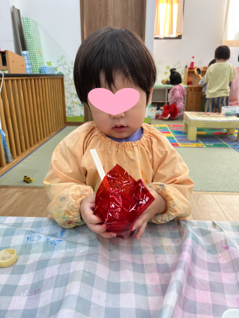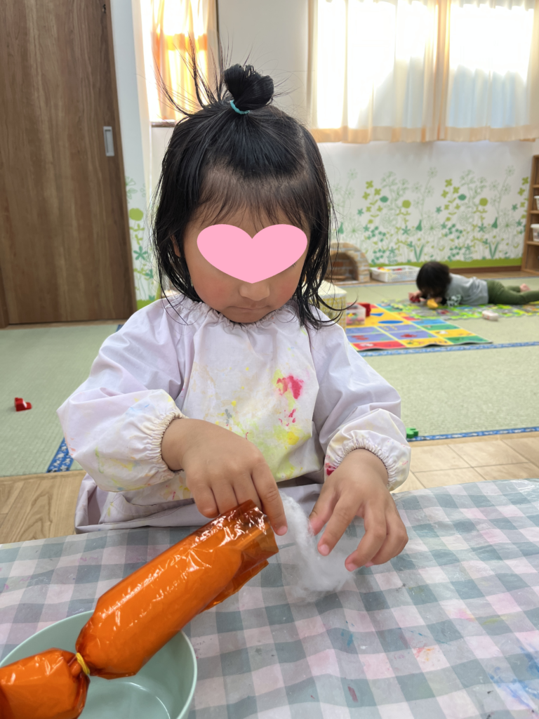 にじぐみさんも綿を使っていますね。折り紙やセロファンも使いながら一生懸命包んで完成したのは・・・?!