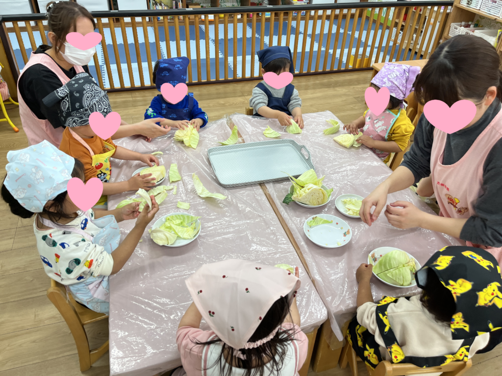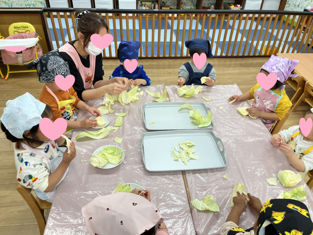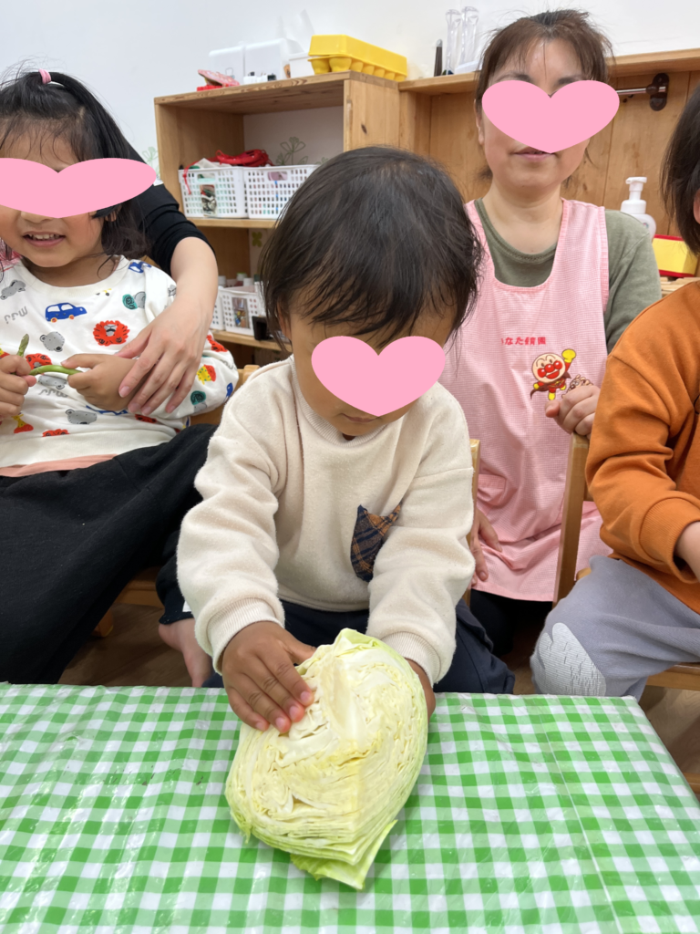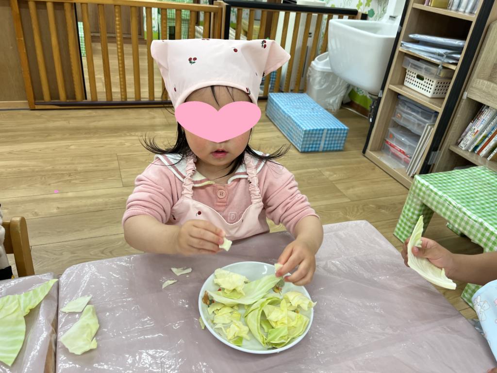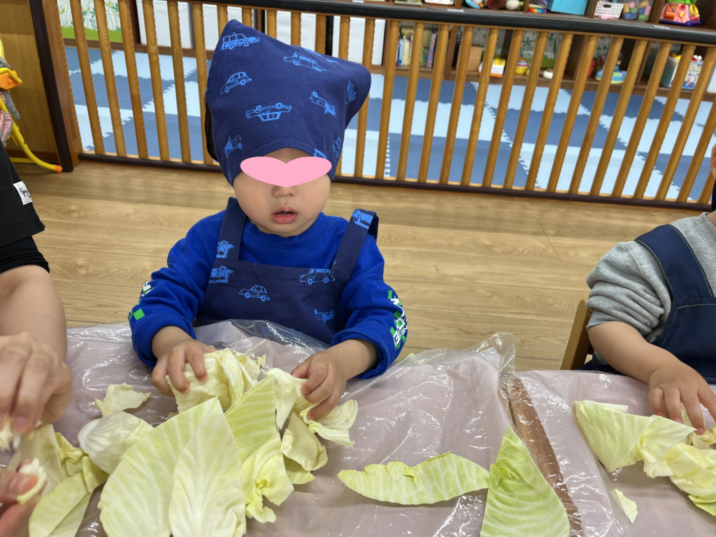 「かたいねー!」とお話しながら、保育者の真似をして上手にキャベツをちぎっていましたよ!