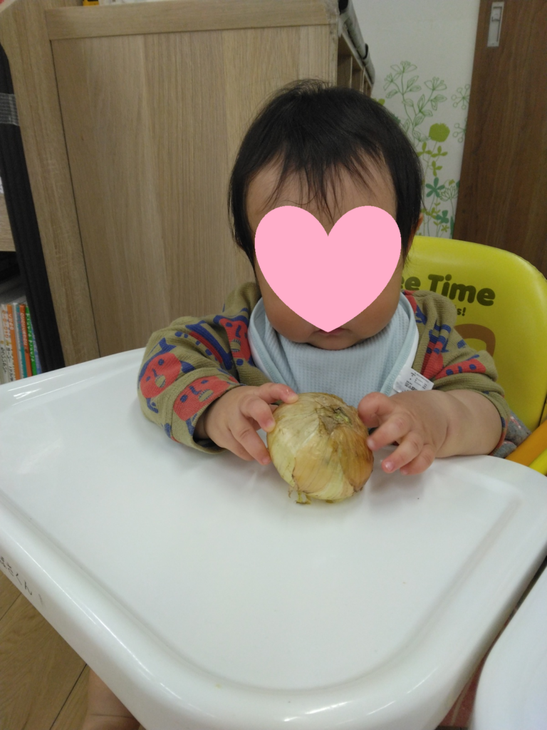 キャベツや玉ねぎ、アスパラガスに実際に触れて、感触を楽しむ子どもたち・・・